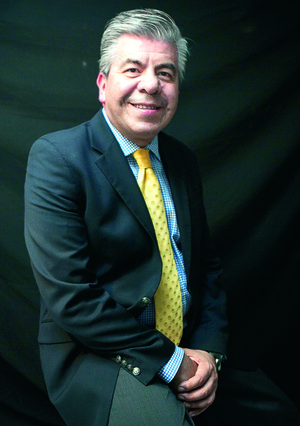 Raúl Flores, vestido con traje azul marino y corbata en un tono entre amarillo y dorado, es risueño pero puede cambiar de un momento a otro para mostrar un rostro serio.