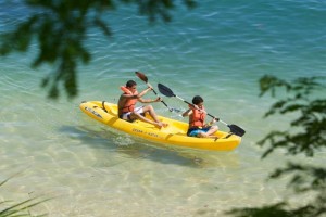 Esnórquel, buceo y kayak son las formas ideales para familiarizarse con el entorno. Las aguas tranquilas y cristalinas permiten apreciar el inmenso mundo marino: familias enteras de peces coloridos, corales y por si faltara poco, de noviembre a marzo se puede ver, sin necesidad de binoculares, el salto de las ballenas jorobadas.