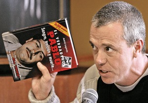 BOGOTÁ. El Popeye muestra el libro que escribió en 2005 sobre la vida de Pablo Escobar, durante el juicio contra el político Alberto Santofimio Botero, en 2006. (Foto: ARCHIVO AP )