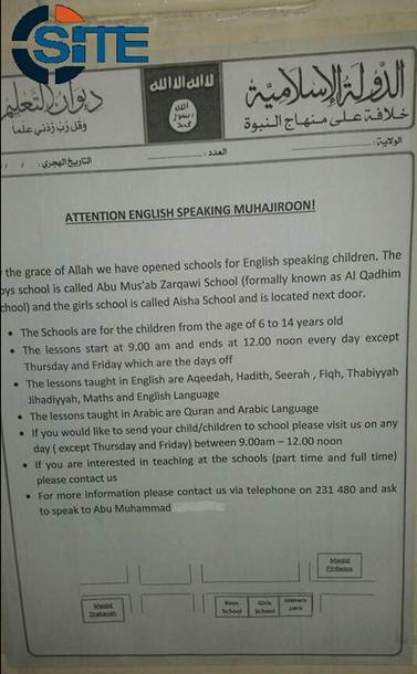 El analista de grupos extremistas SITE Intelligence Group ha reportado que militantes del EI han estado repartiendo volantes para promocionar una escuela para niños extranjeros que hablen inglés.