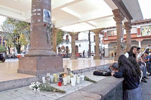 RECUERDO. Familiares y amigos colocaron veladoras y flores en las columnas de La Pérgola, a manera de altar para Kassandra, justo a espaldas de la Plaza de Los Mártires de Uruapan. (Foto: RAÚL TINOCO / EL UNIVERSAL )