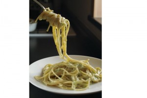 Cocer el espagueti en agua, con un chorrito de aceite de oliva y sal. Hervir durante 8 minutos para quede al dente e inmediatamente escurrir y enjuagar con agua fría.