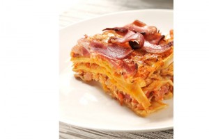 Engrasar un refractario con mantequilla, colocar una capa de pasta como base, sobre ella una capa de pollo con salsa y queso manchego rallado. Repetir tres veces. En la capa final agregar las rebanadas de tocino crudo sobre el queso. Hornear destapado en horno precalentado a 350°F( 150!°C) durante 25 a 30 minutos hasta que el queso quede gratinado y el tocino bien dorado.