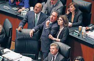 EXPECTACIÓN. Los senadores René Juárez Cisneros, Emilio Gamboa Patrón, Hilda Estela Flores y Enrique Burgos, atentos al tablero de votación electrónica. (Foto: LEO MORALES / EL UNIVERSAL )