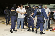 Posterior al bajar de la unidad aérea XC-LKB, fueron escoltados por una veintena de elementos de la Agencia Federal de Investigación (AFI) con rumbo a las oficinas de la Subprocuraduría de Investigación Especializada en Delincuencia Organizada (SIEDO) en la Ciudad de México.