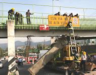 El puente que ayer resultó dañado por un tráiler en avenida Insurgentes Sur, a la altura del centro comercial Perisur, fue retirado esta madrugada, después de 10 horas de cierre vial, a causa de trabajos para retirar un puente peatonal dañado por un tráiler que transportaba maquinaria.