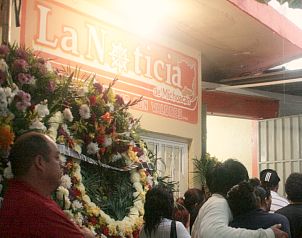 Adiós Familiares, amistades y periodistas acompañaron al féretro que contenía los restos mortales de Miguel Angel Villagómez Valle, editor del diario La Noticia de Michoacán, el que llevaron para ser despedido de las instalaciones del matutino. (Foto: Rafael Rivera Millan / Corresponsal )