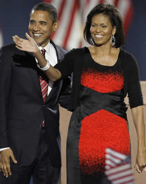 Narciso Rodríguez diseñó el atractivo vestido rojo con negro que Michelle Obama lució la noche del martes, cuando su esposo triunfó como presidente electo de Estados Unidos.